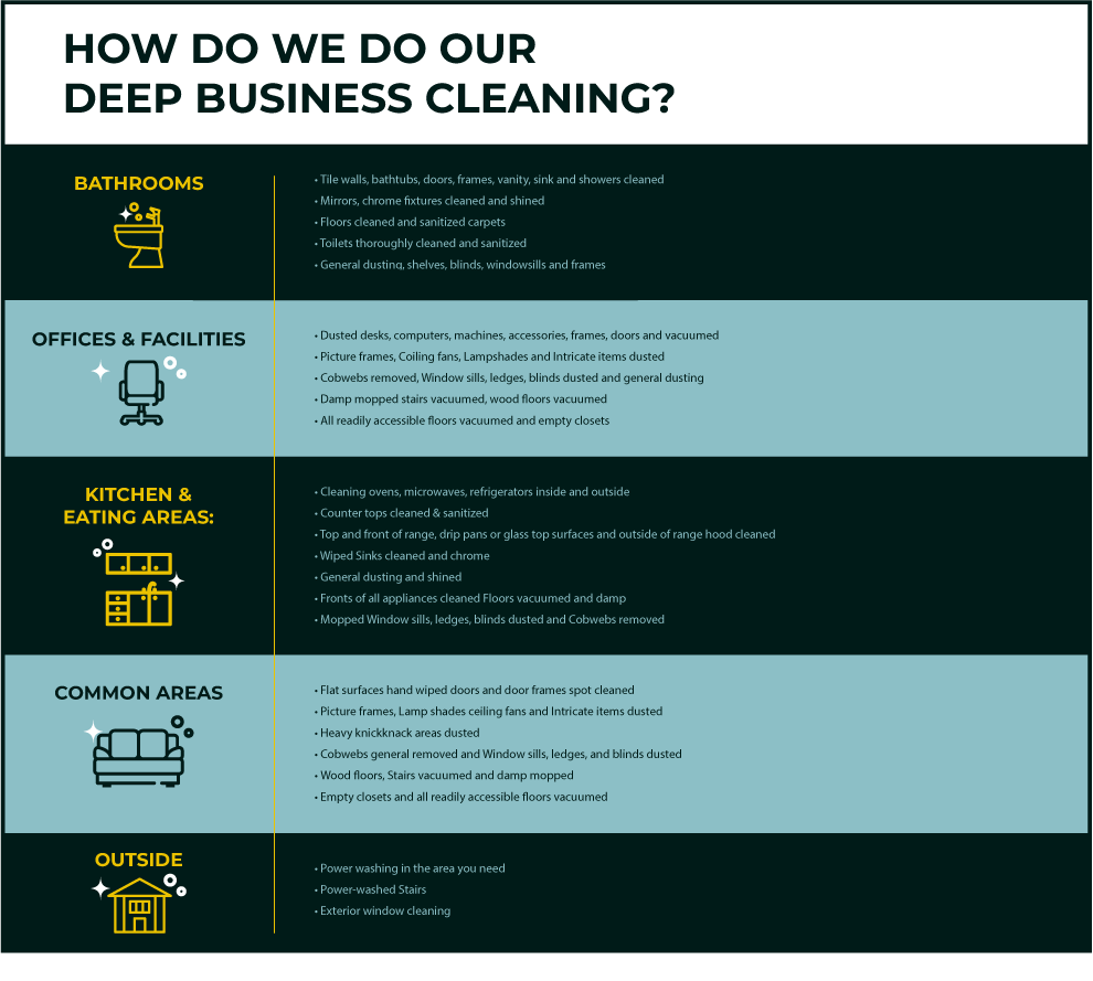 We provide a guaranteed deep cleaning to your business or facility, We clean and disinfect common areas, offices, desks, bathrooms, kitchens, work areas, laundry areas, machines and much more!